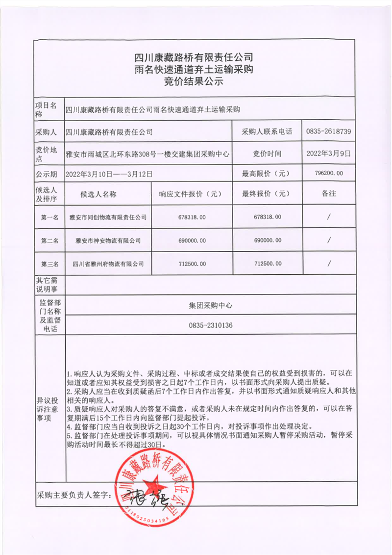 四川康藏路桥有限责任公司雨名快速通道弃土运输采购竞价结果公示