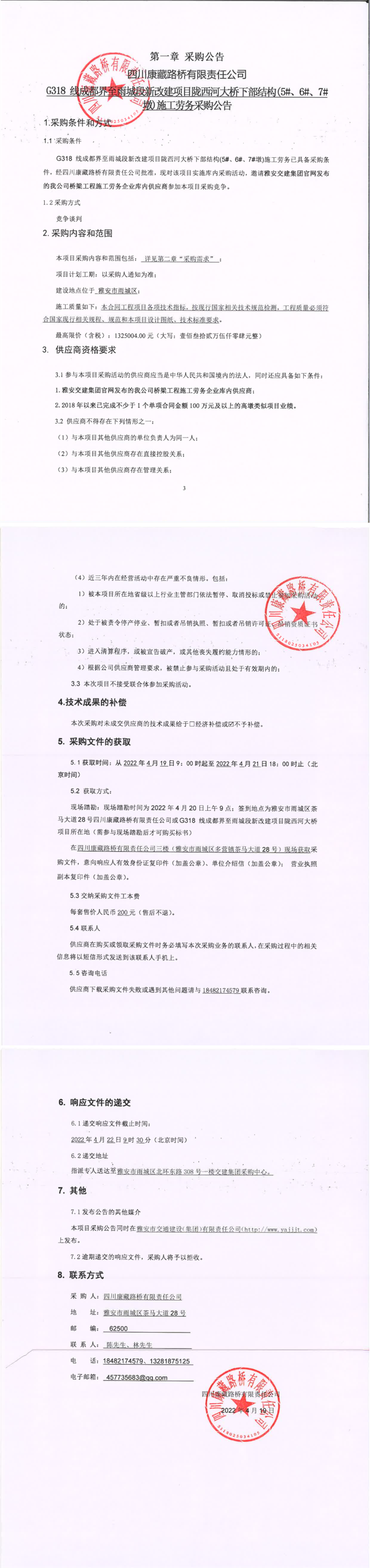 四川康藏路桥有限责任公司G318线成都界至雨城段新改建项目陇西河大桥下部结构(5#、6#、7#墩)施工劳务采购公告