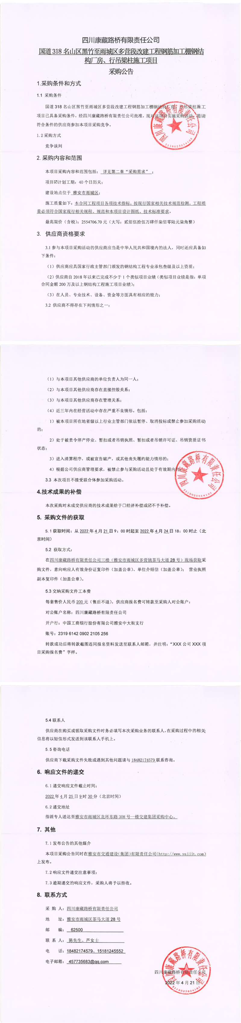 四川康藏路桥有限责任公司国道318名山区黑竹至雨城区多营段改建工程钢筋加工棚钢结构厂房、行吊梁柱施工项目采购公告
