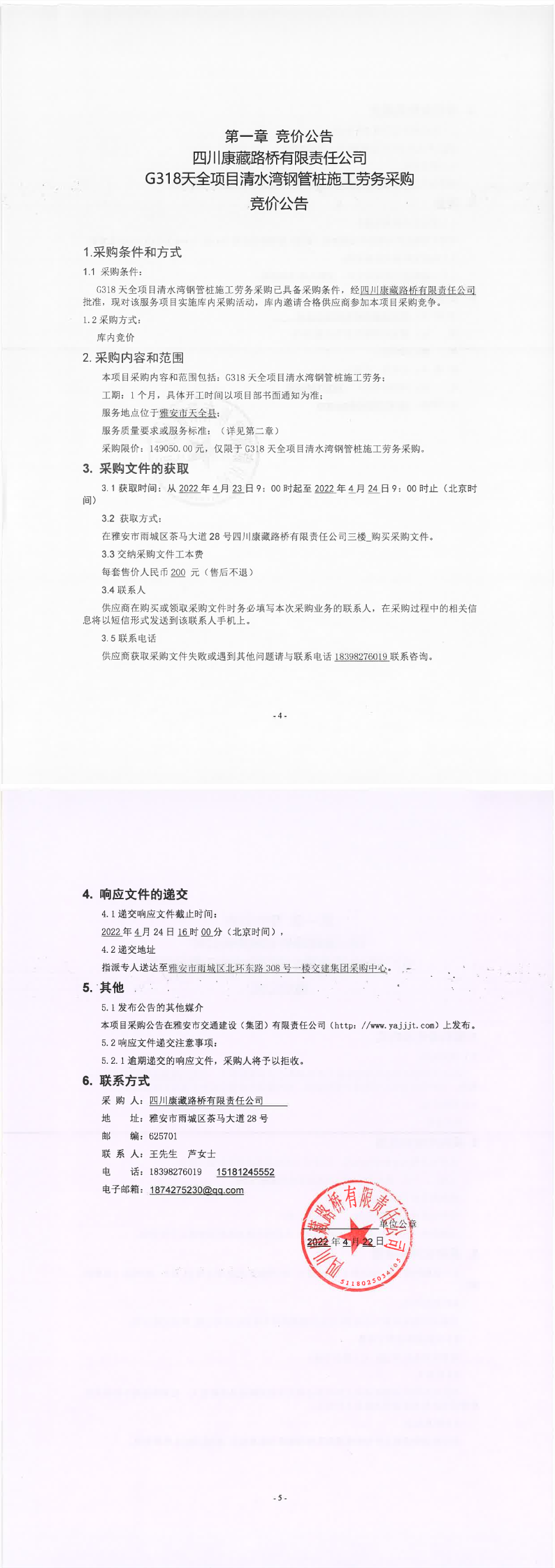 四川康藏路桥有限责任公司G318天全项目清水湾钢管桩施工劳务采购竞价公告