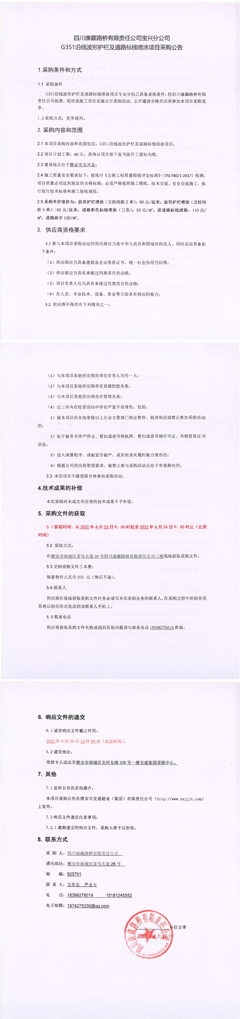 四川康藏路桥有限责任公司宝兴分公司G351沿线波形护栏及道路标线喷涂项目采购公告