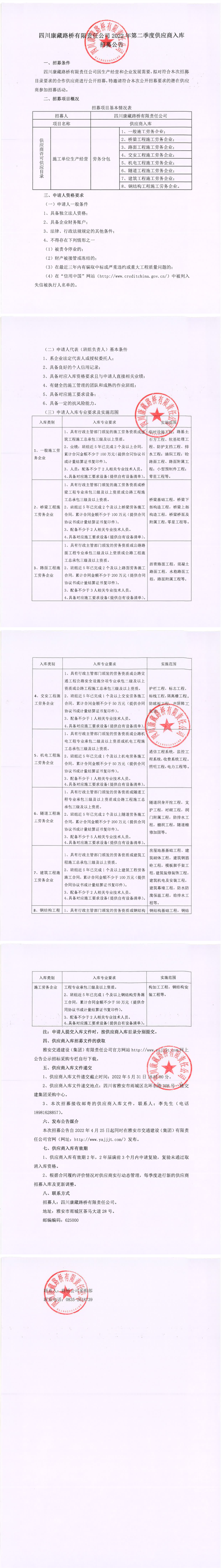 四川康藏路桥有限责任公司2022年第二季度供应商入库招募公告