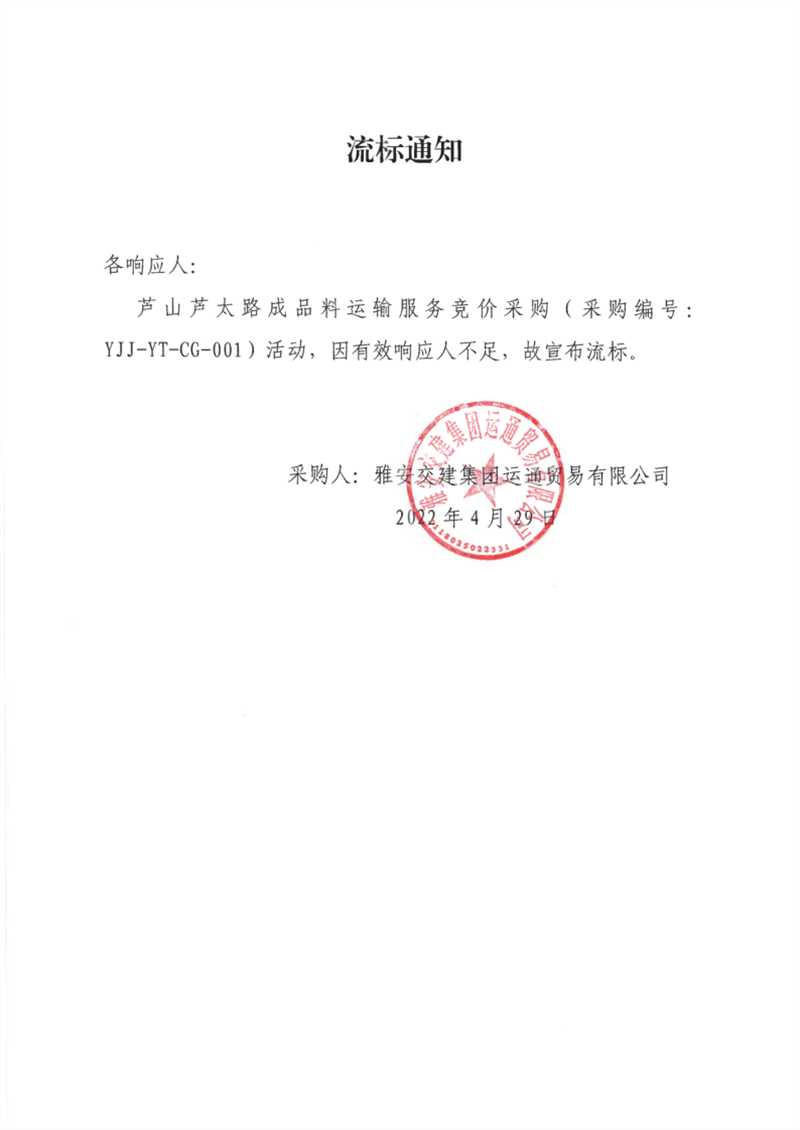 大红鹰dhy(中国)集团运通贸易有限公司芦山芦太路成品料运输服务竞价采购流标通知