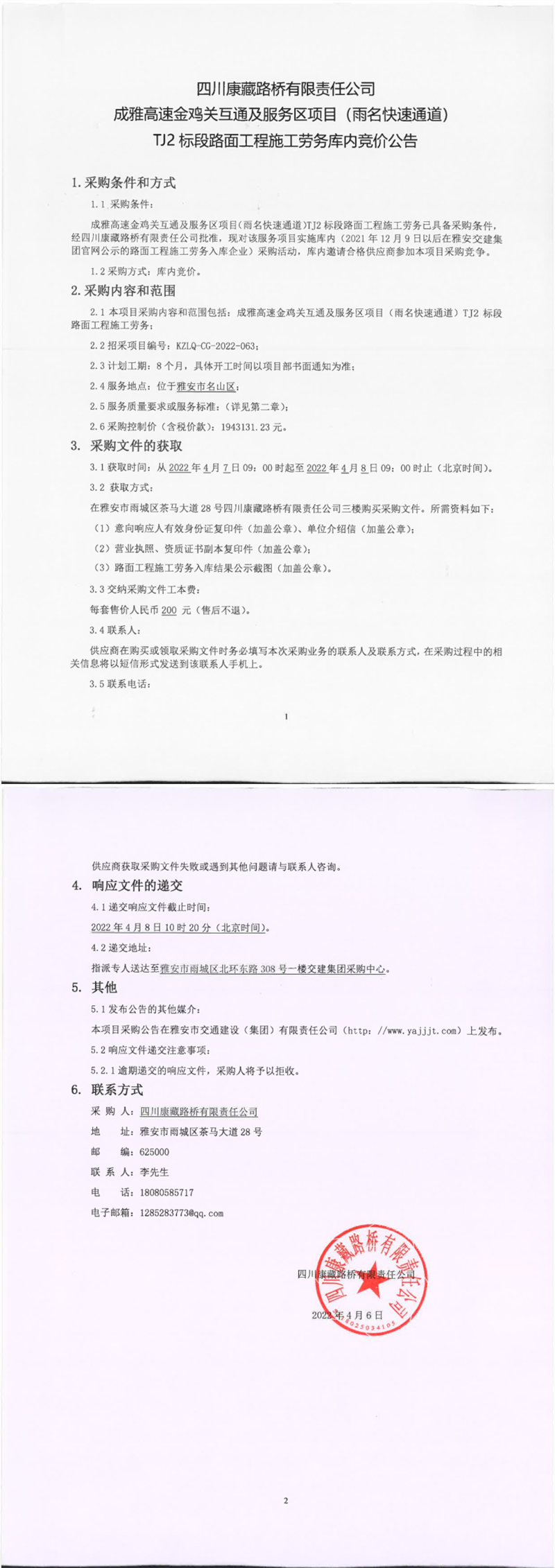 四川康藏路桥有限责任公司成雅高速金鸡关互通及服务区项目(雨名快速通道)TJ2标段路面工程施工劳务库内竞价公告