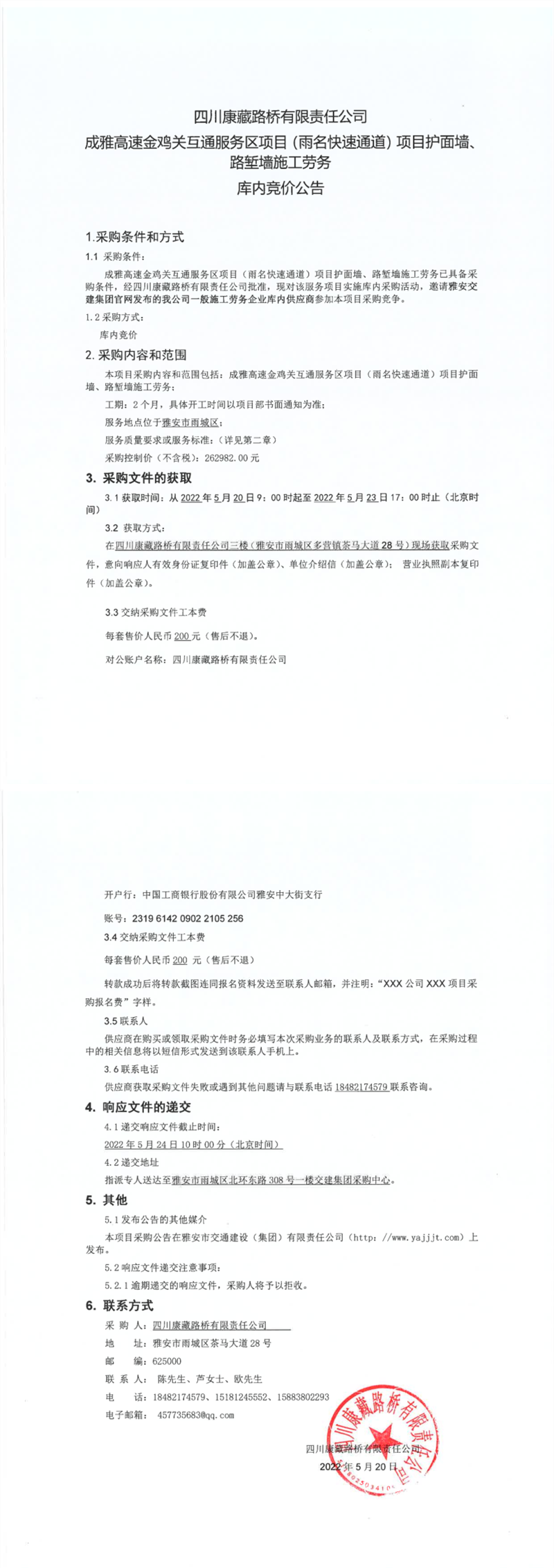 四川康藏路桥有限责任公司成雅高速金鸡关互通服务区项目(雨名快速通道)项目护面墙、路堑墙施工劳务库内竞价公告