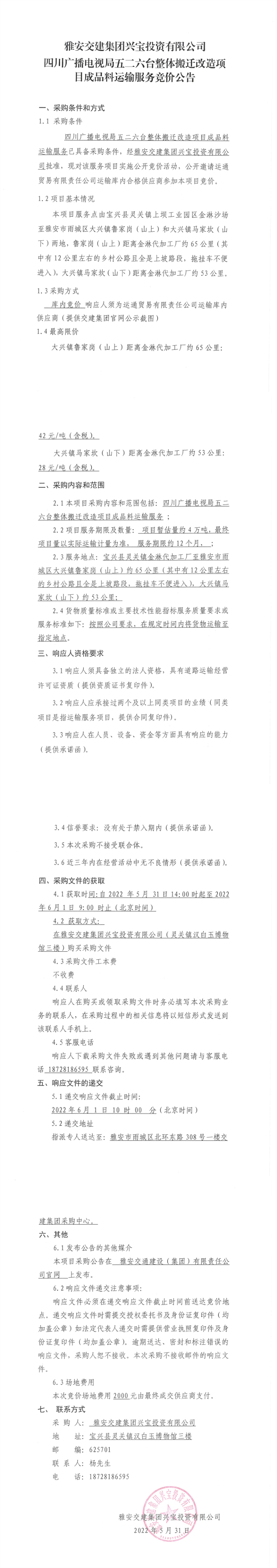 大红鹰dhy(中国)集团兴宝投资有限公司四川广播电视局五二六台整体搬迁改造项目成品料运输服务竞价公告
