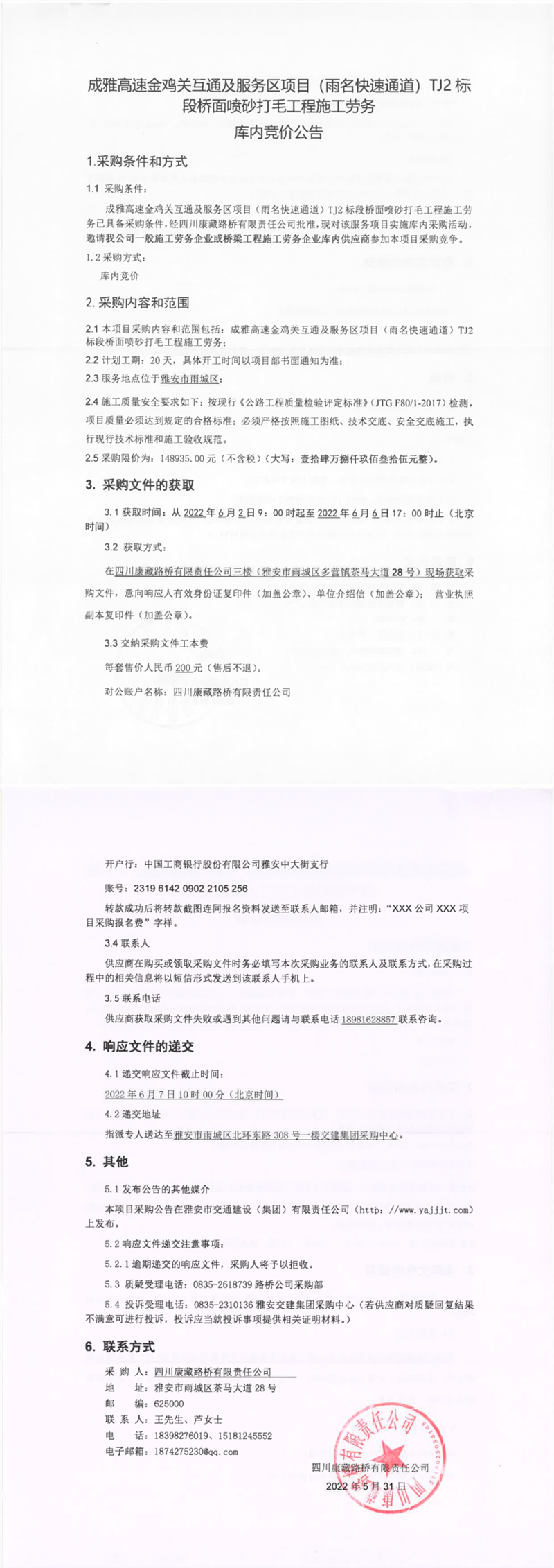 四川康藏路桥有限责任公司成雅高速金鸡关互通及服务区项目(雨名快速通道)TJ2标段桥面喷砂打毛工程施工劳务库内竞价公告