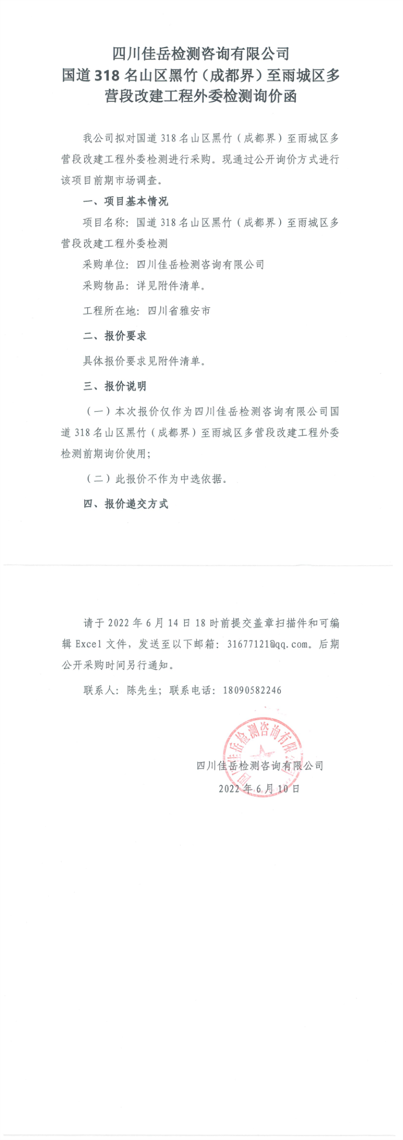 四川佳岳检测咨询有限公司国道318名山区黑竹(成都界)至雨城区多营段改建工程外委检测询价函