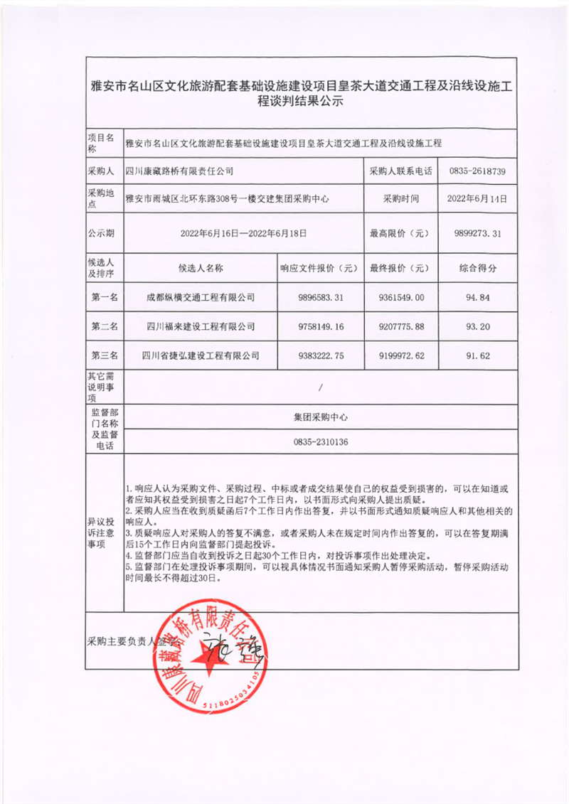 四川康藏路桥有限责任公司雅安市名山区文化旅游配套基础设施建设项目皇茶大道交通工程及沿线设施工程谈判结果公示