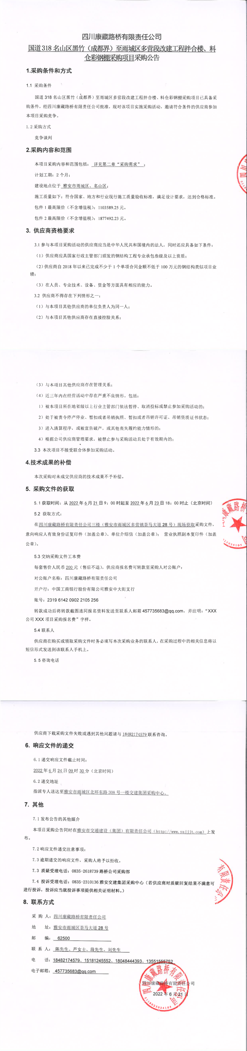 四川康藏路桥有限责任公司国道318名山区黑竹(成都界)至雨城区多营段改建工程拌合楼、料仓彩钢棚采购项目采购公告