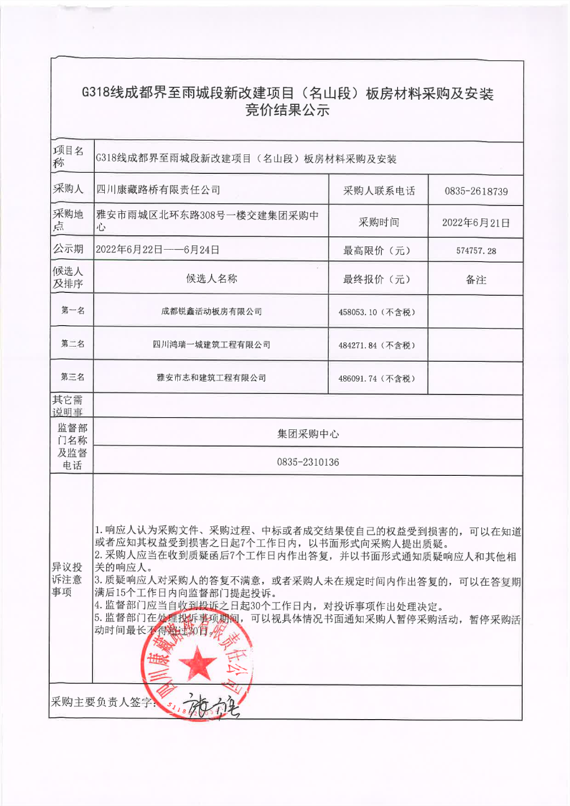 四川康藏路桥有限责任公司G318线成都界至雨城段新改建项目(名山段)板房材料采购及安装竞价结果公示