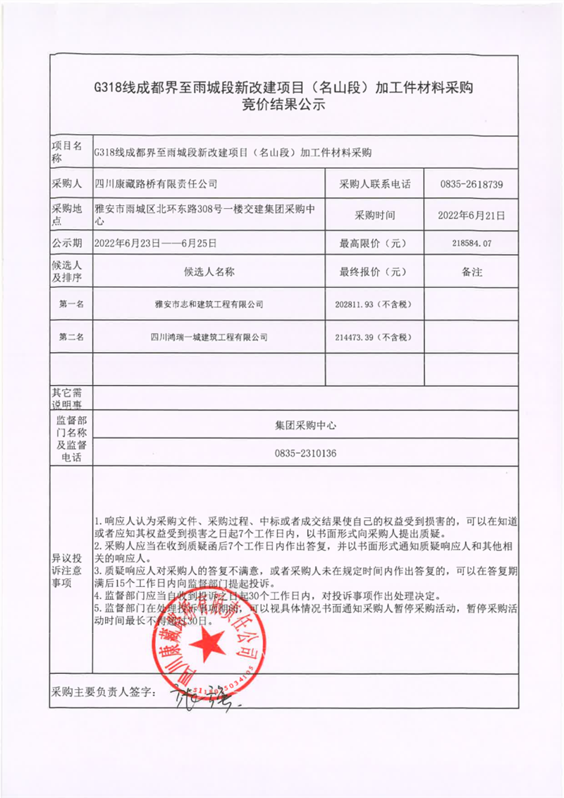 四川康藏路桥有限责任公司G318线成都界至雨城段新改建项目(名山段)加工件材料采购竞价结果公示