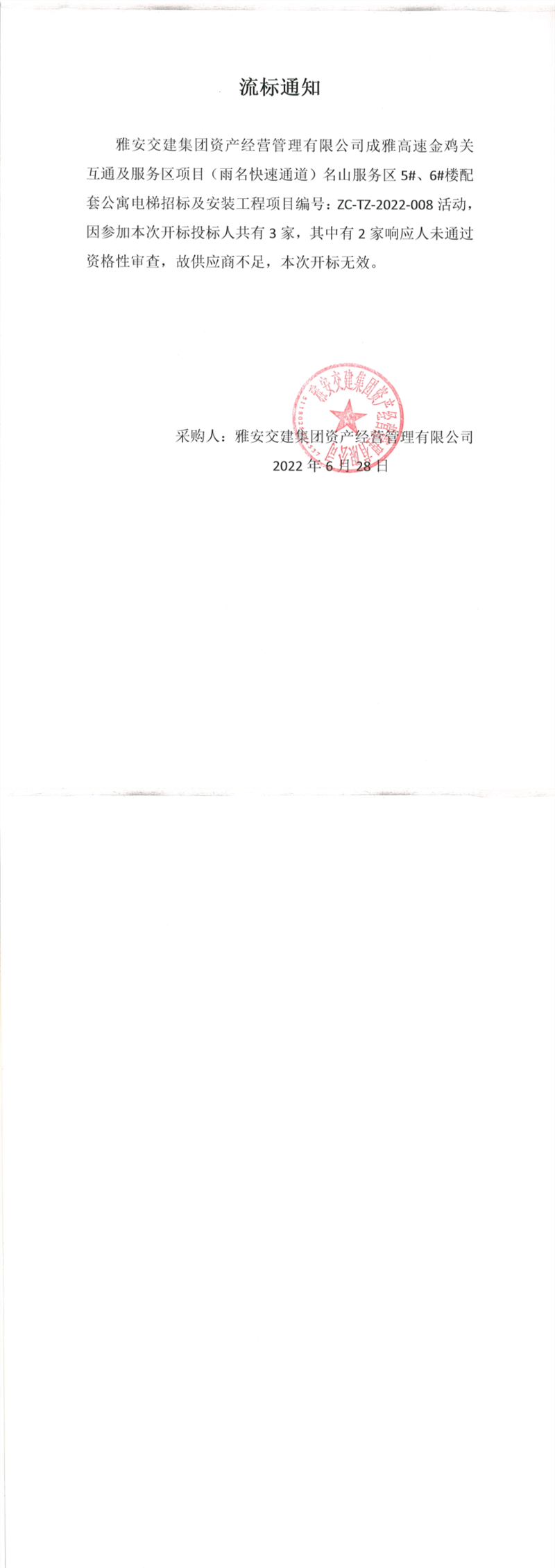 大红鹰dhy(中国)集团资产经营管理有限公司成雅高速金鸡关互通及服务区(雨名快速通道)名山服务区5#、6#楼配套公寓电梯招标及安装工程项目流标通知