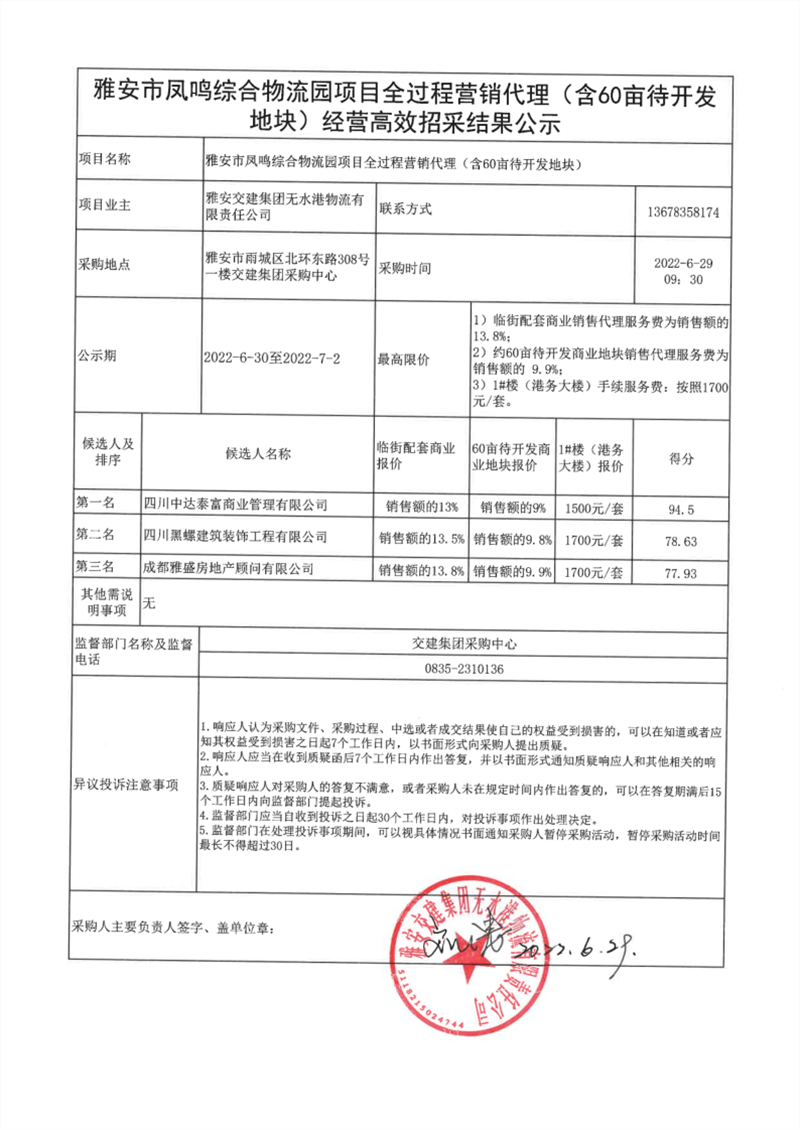 大红鹰dhy(中国)集团无水港物流有限责任公司雅安市凤鸣综合物流园项目全过程营销代理(含60亩待开发地块)经营高效招采结果公示