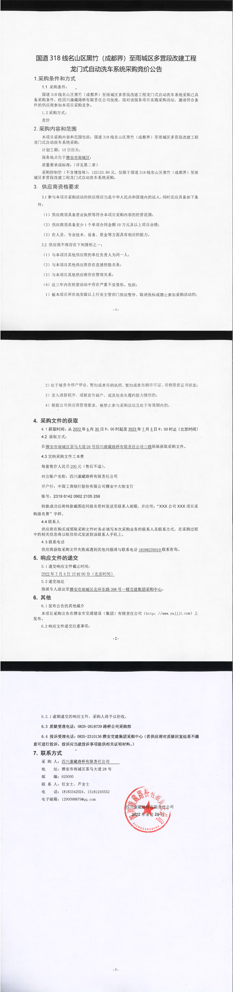 四川康藏路桥有限责任公司国道318线名山区黑竹(成都界)至雨城区多营段改建工程龙门式自动洗车系统采购竞价公告