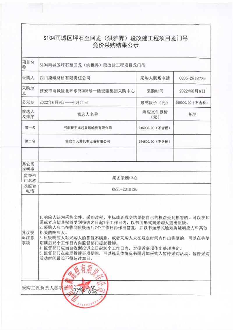 四川康藏路桥有限责任公司S104雨城区坪石至回龙(洪雅界)段改建工程项目龙门吊竞价采购结果公示