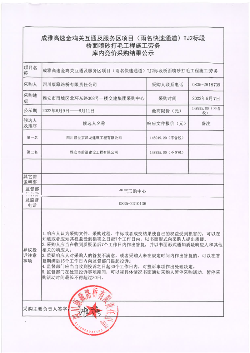 四川康藏路桥有限责任公司成雅高速金鸡关互通服务区项目(雨名快速通道)TJ2标段桥面喷砂打毛工程施工劳务库内竞价采购结果公示