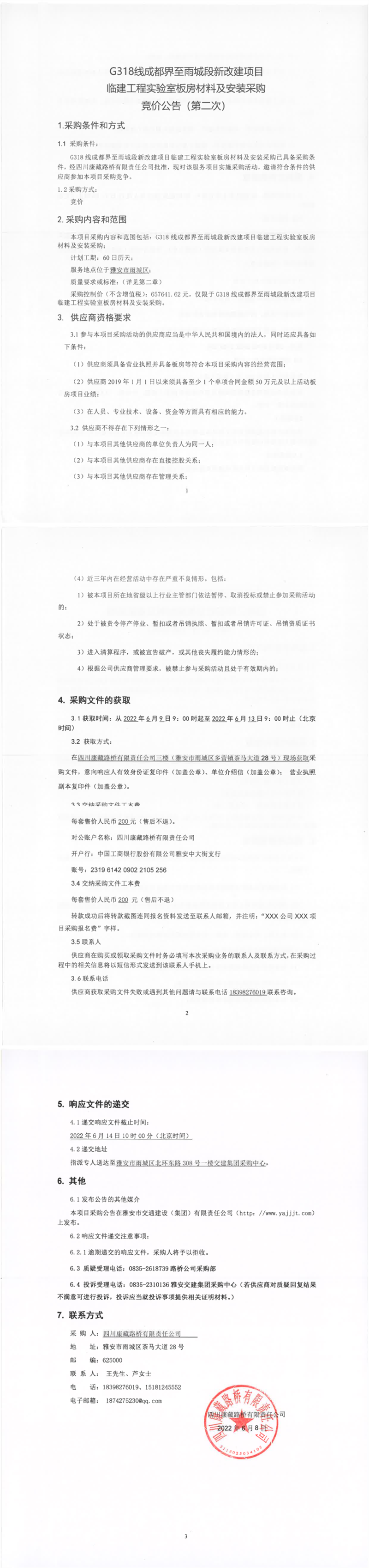 四川康藏路桥有限责任公司G318线成都界至雨城段新改建项目临建工程实验室板房材料及安装采购竞价公告(第二次)