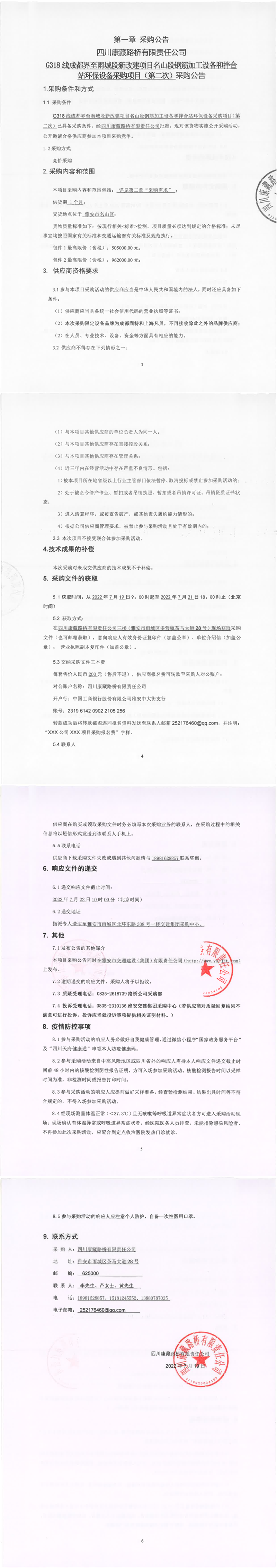 四川康藏路桥有限责任公司G318线成都界至雨城段新改建项目名山段钢筋加工设备和拌合站环保设备采购项目(第二次)采购公告