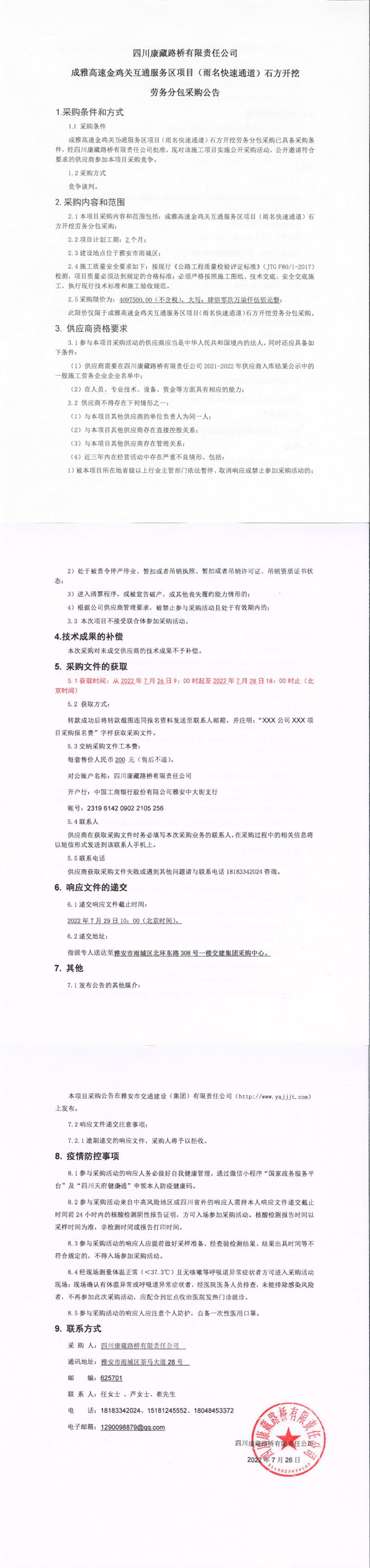 四川康藏路桥有限责任公司成雅高速金鸡关互通及服务区项目(雨名快速通道)石方开挖劳务分包采购公告