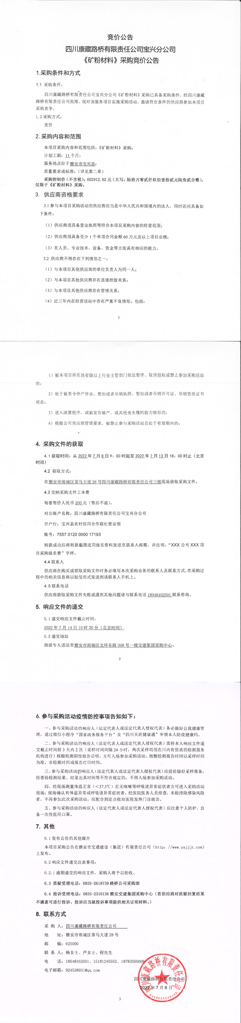 四川康藏路桥有限责任公司宝兴分公司矿粉材料采购竞价公告