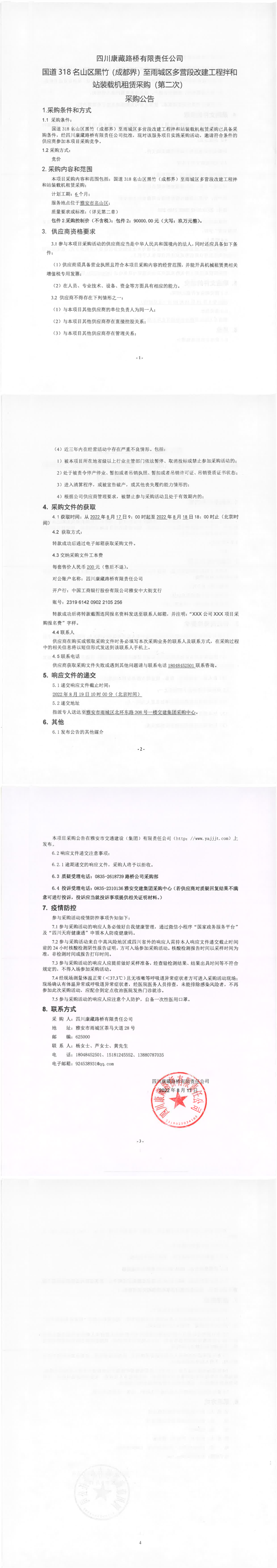 四川康藏路桥有限责任公司国道318名山区黑竹(成都界)至雨城区多营段改建工程拌和站装载机租赁采购(第二次)采购公告