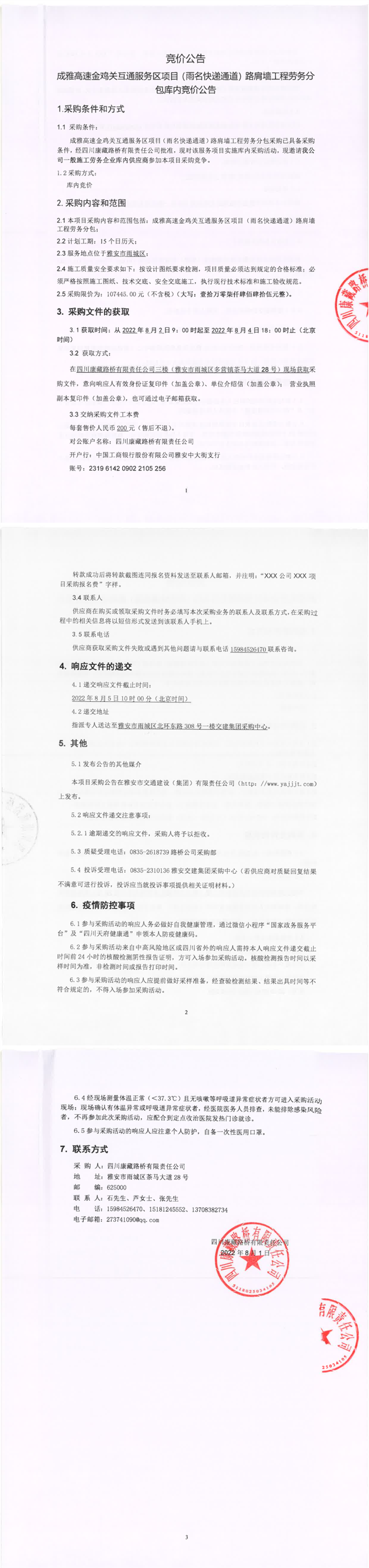 四川康藏路桥有限责任公司成雅高速金鸡关互通服务区项目(雨名快速通道)路肩墙工程劳务分包库内竞价公告