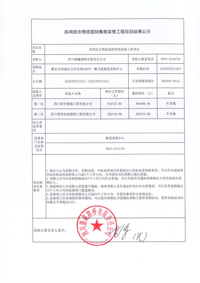 四川康藏路桥有限责任公司凤鸣综合物流园销售部装修工程项目结果公示