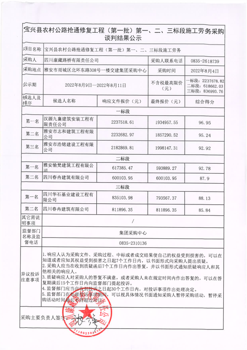 四川康藏路桥有限责任公司宝兴县农材公路抢通修复工程(第一批)第一、二、三标段施工劳务谈判结果公示