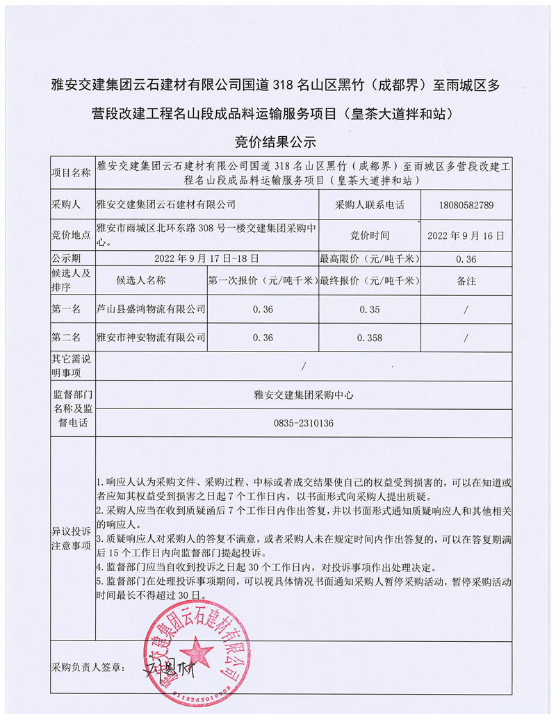 大红鹰dhy(中国)集团云石建材有限公司国道318名山区黑竹(成都界)至雨城区多营段改建工程雨城段成品料运输服务项目(皇茶大道拌和站)竞价结果公示