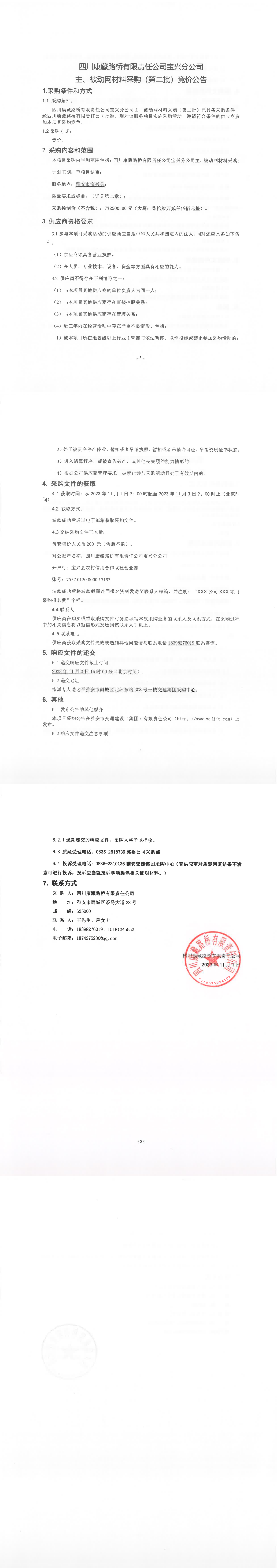 四川康藏路桥有限责任公司宝兴分公司主、被动网材料采购(第二批)竞价公告