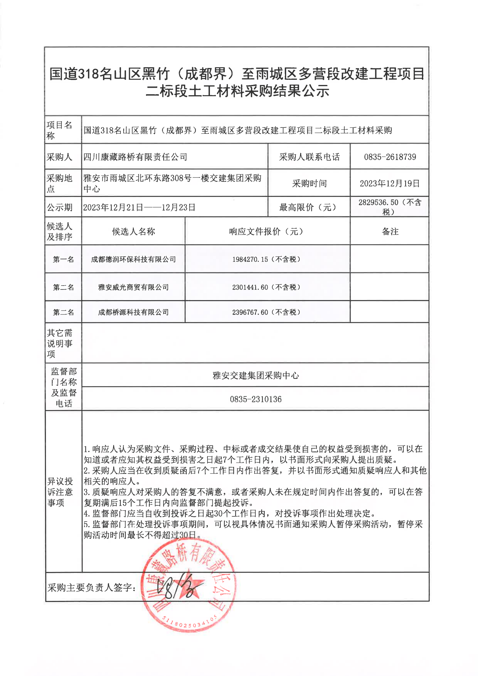 四川康藏路桥有限责任公司国道318名山区黑竹(成都界)至雨城区多营段改建工程项目二标段土工材料采购结果公示