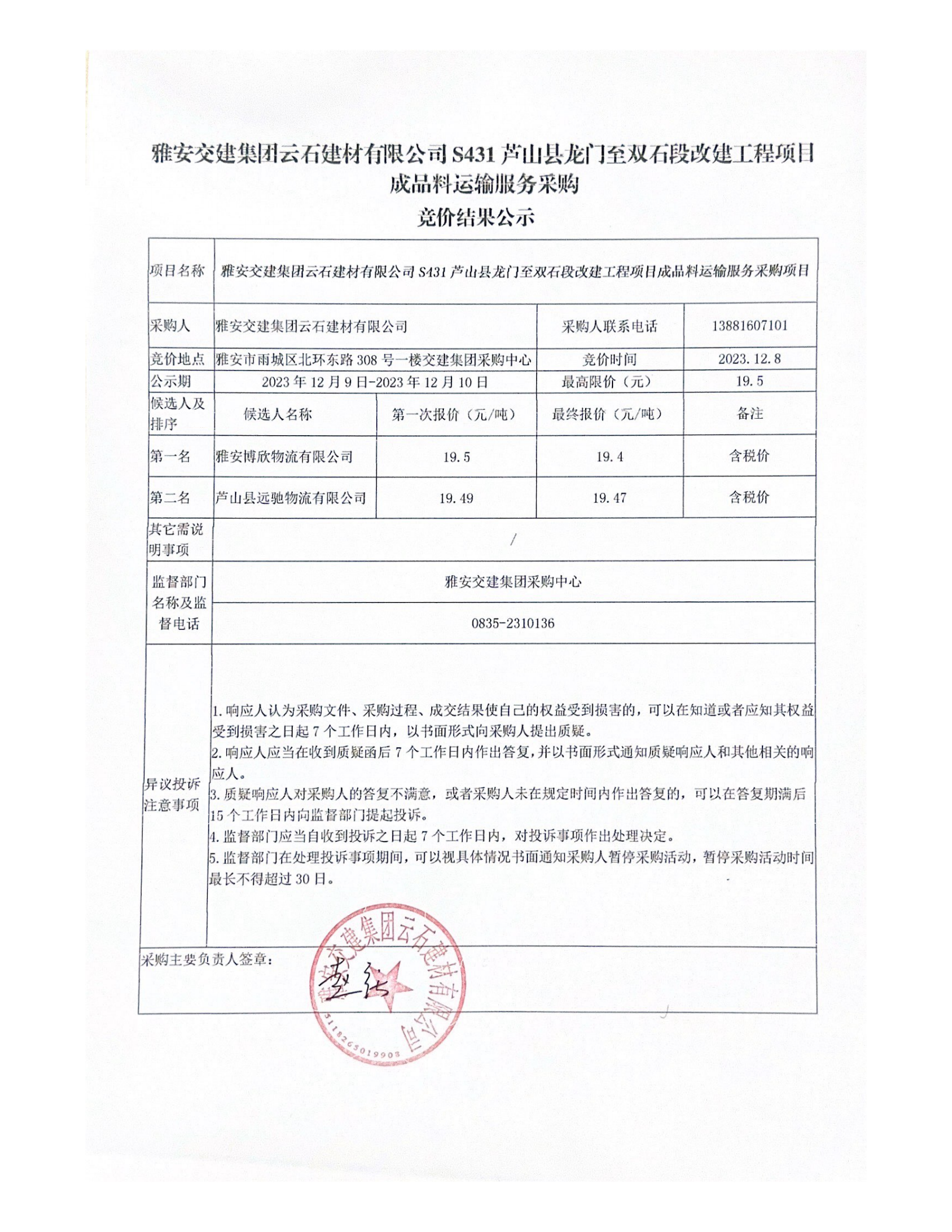 大红鹰dhy(中国)集团云石建材有限公司S431芦山县龙门至双石段改建工程项目成品料运输服务采购竞价结果公示