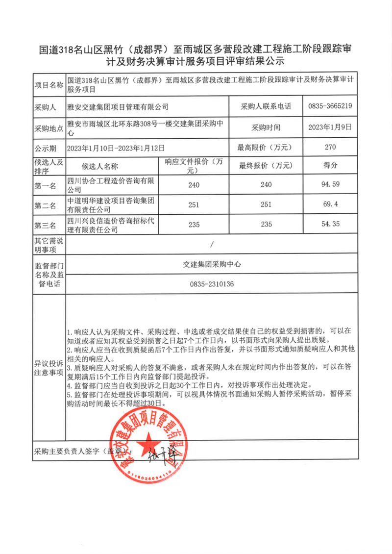 大红鹰dhy(中国)集团项目管理有限公司国道318名山区黑竹(成都界)至雨城区多营段改建工程施工阶段跟踪审计及财务决算审计服务项目评审结果公示