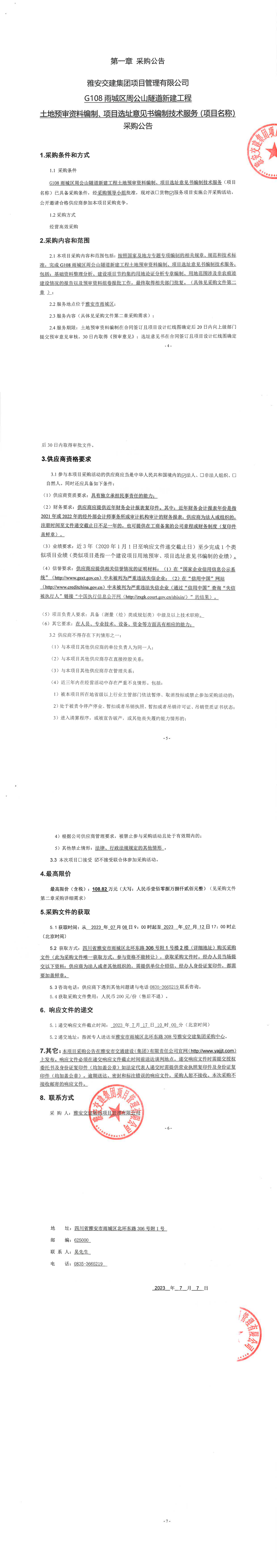大红鹰dhy(中国)集团项目管理有限公司G108雨城区周公山隧道新建工程土地预审资料编制、项目选址意见书编制技术服务(项目名称)采购公告