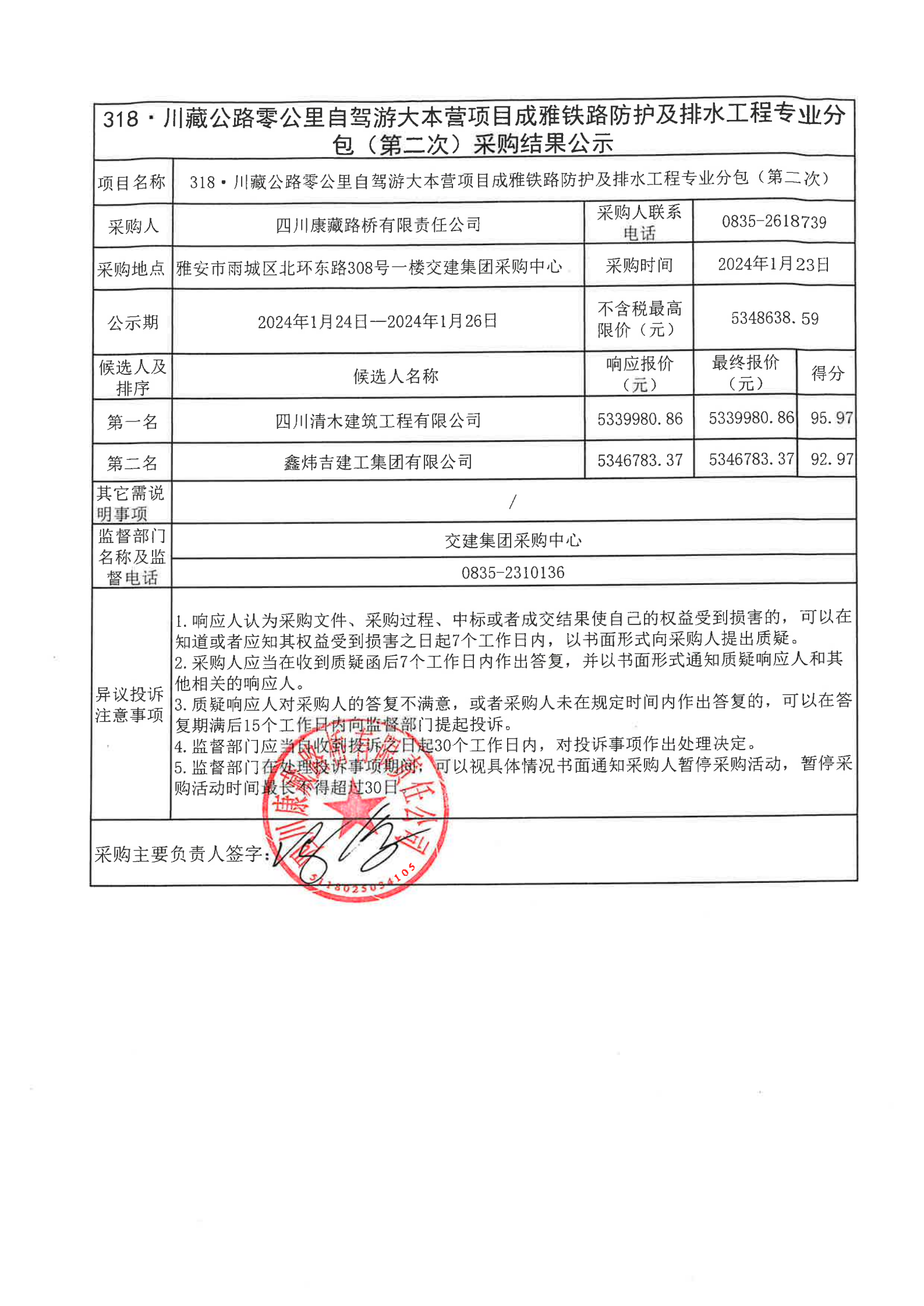 四川康藏路桥有限责任公司318·川藏公路零公里自驾游大本营项目成雅铁路防护及排水工程专业分包(第二次)采购结果公示