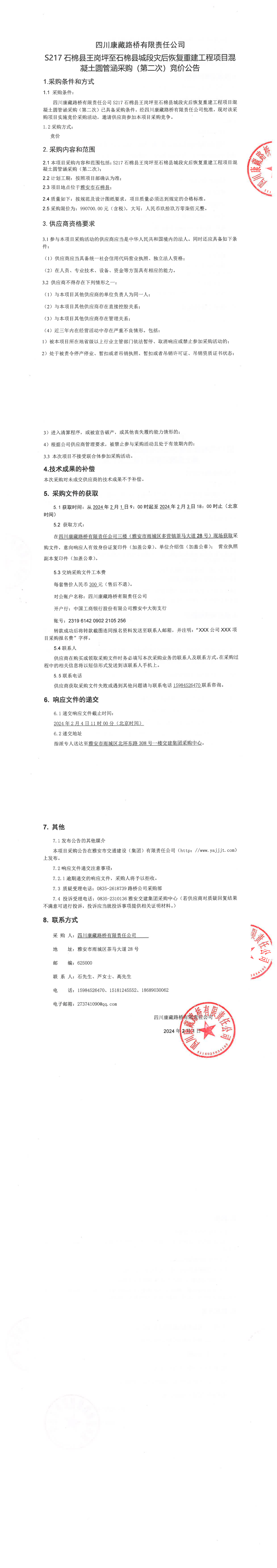 四川康藏路桥有限责任公司S217石棉县王岗坪至石棉县城段灾后恢复重建工程项目混凝土圆管涵采购(第二次)竞价公告