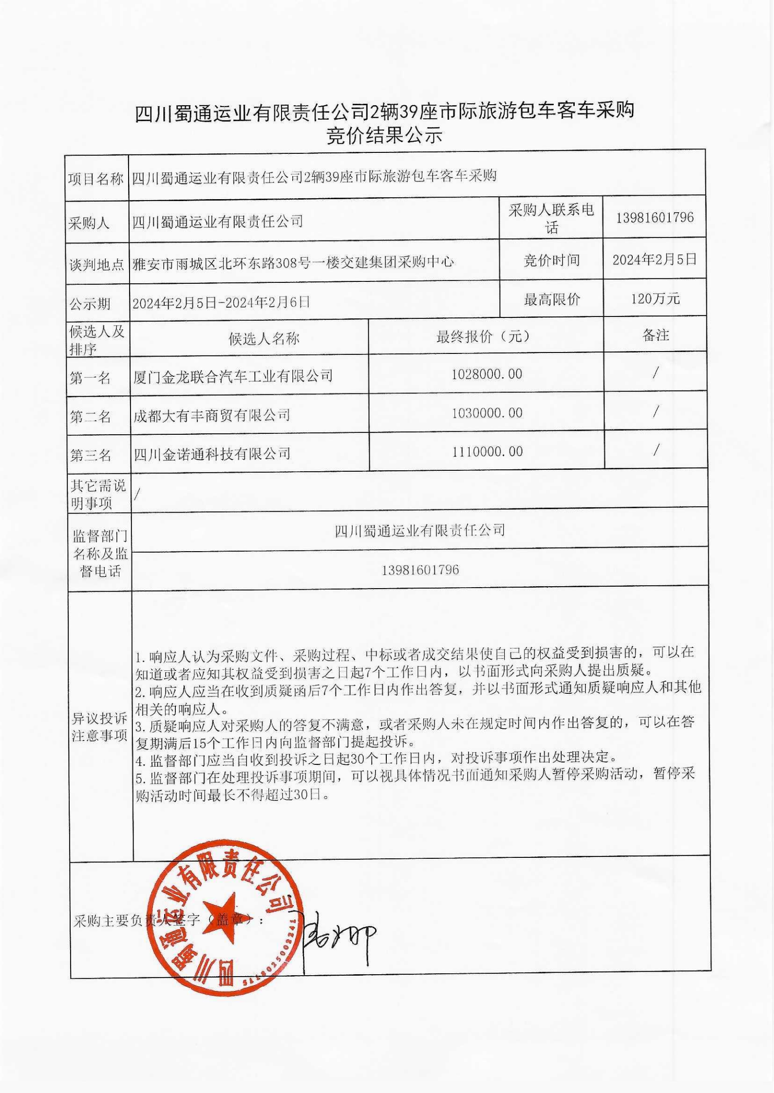 四川蜀通运业有限责任公司2辆39座市际旅游包车客车采购竞价结果公示