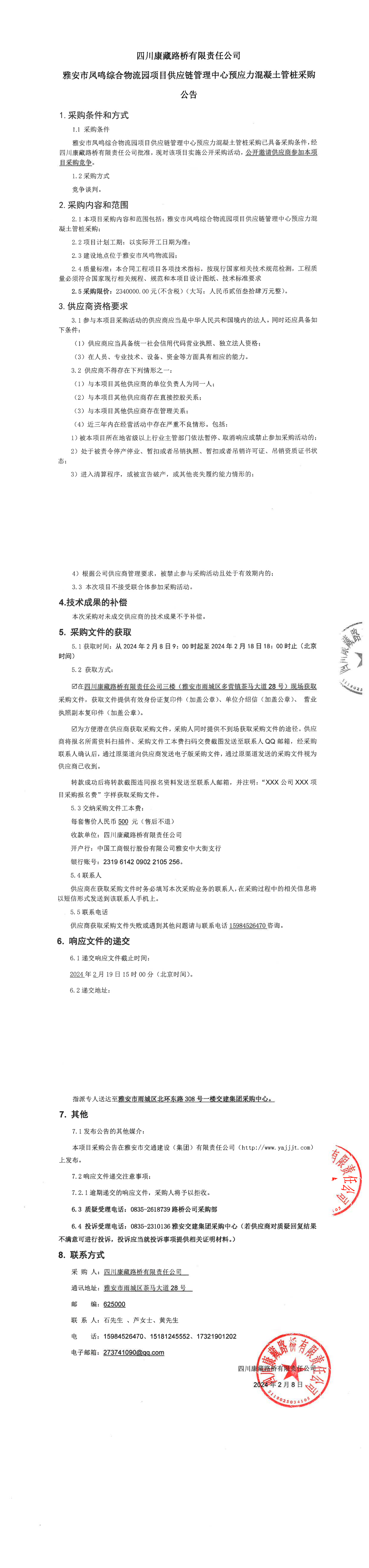 四川康藏路桥有限责任公司雅安市凤鸣综合物流园项目供应链管理中心预应力混凝土管桩采购公告