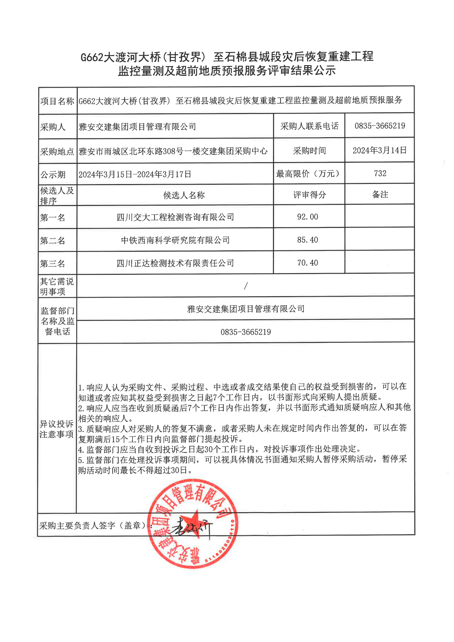 大红鹰dhy(中国)集团项目管理有限公司G662大渡河大桥(甘孜界)至石棉县城段灾后恢复重建工程监控量测及超前地质预报服务评审结果公示