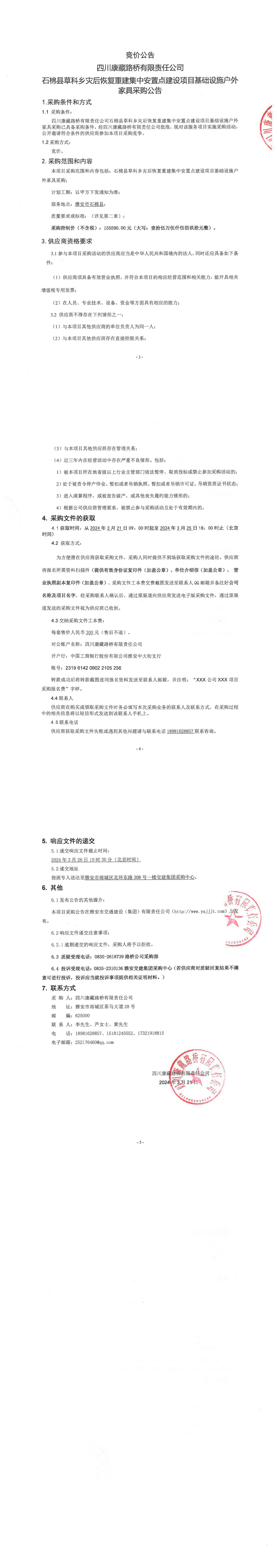 四川康藏路桥有限责任公司石棉县草科乡灾后恢复重建集中安置点建设项目基础设施户外家具采购公告