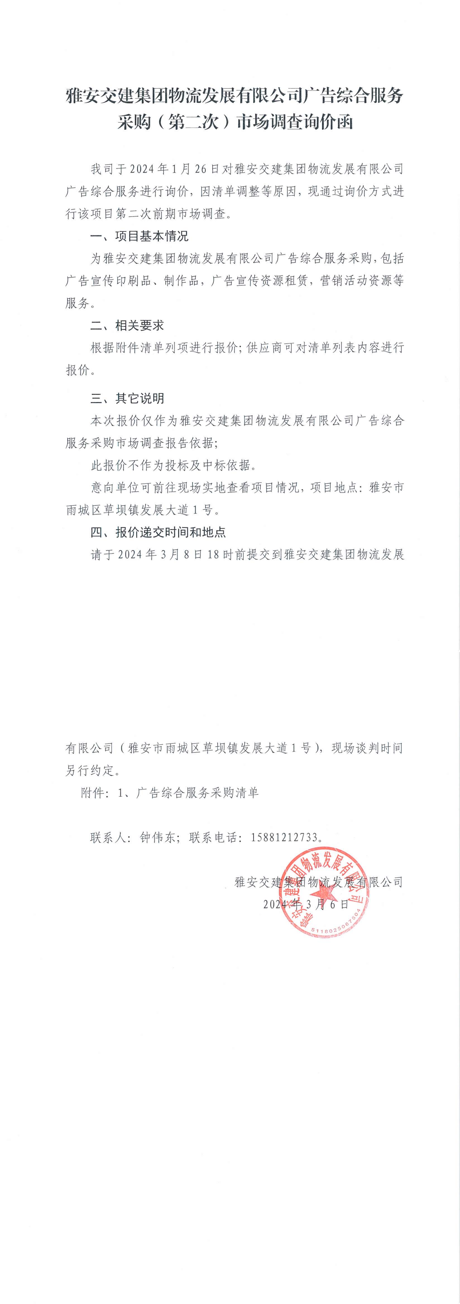 大红鹰dhy(中国)集团物流开展有限公司广告综合服务采购(第二次)市场调查询价函