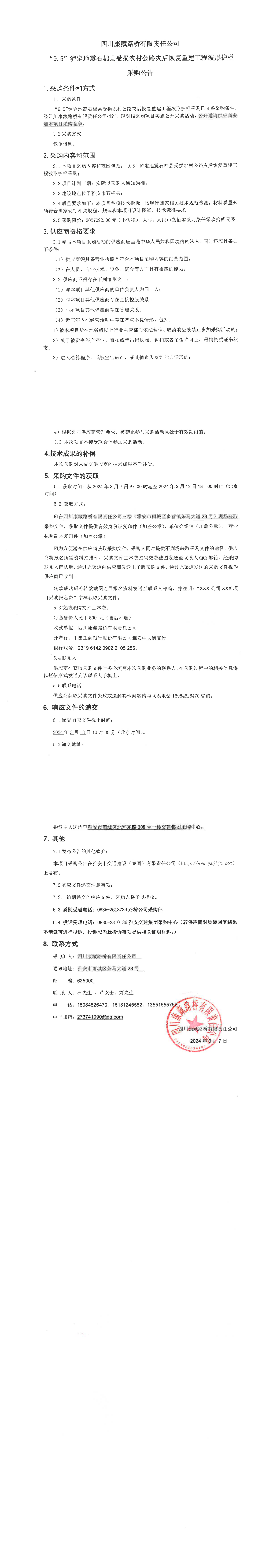 四川康藏路桥有限责任公司“9.5”泸定地震石棉县受损农村公路灾后恢复重建工程波形护栏采购公告