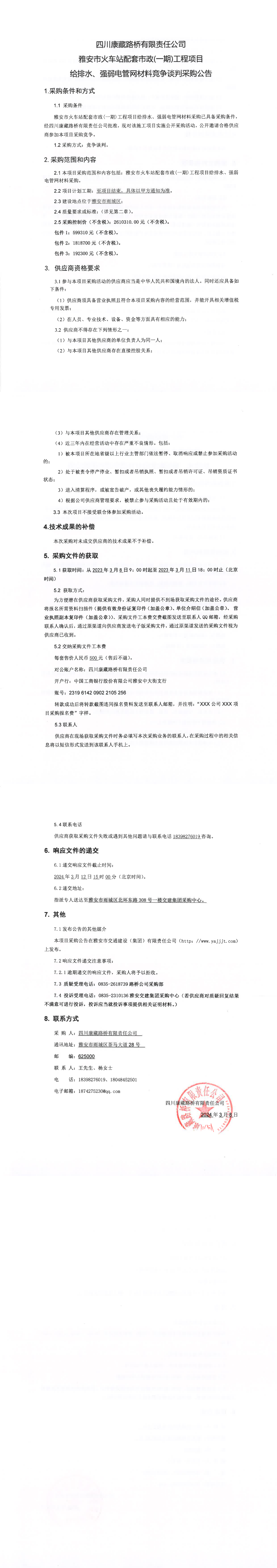 四川康藏路桥有限责任公司雅安市火车站配套市政(一期)工程项目给排水、强弱电管网材料竞争谈判采购公告