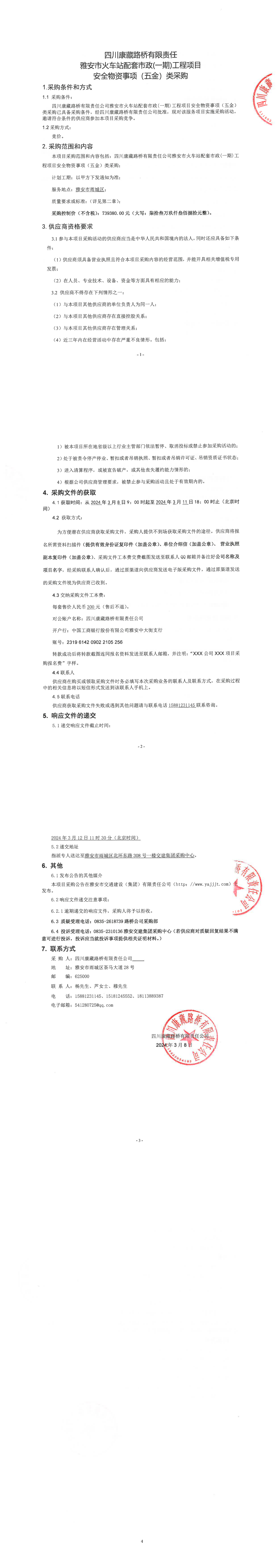四川康藏路桥有限责任公司雅安市火车站配套市政(一期)工程项目安全物资事项(五金)类采购公告