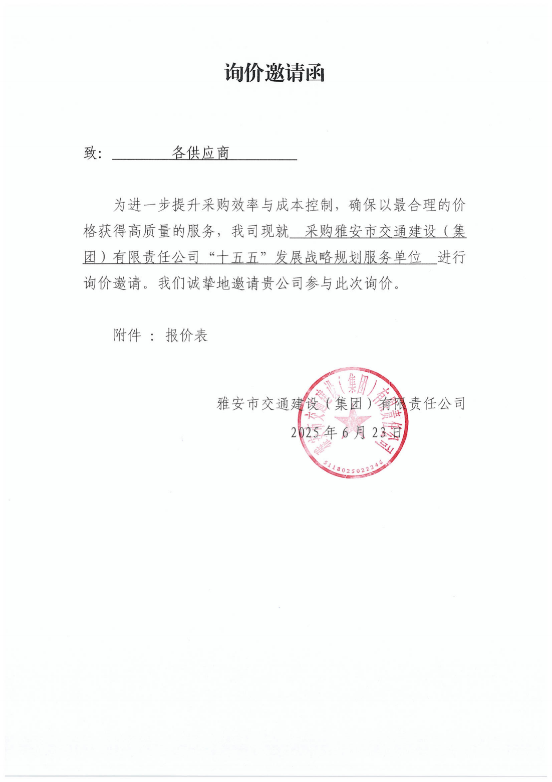 关于采购雅安市交通建设(集团)有限责任公司“十五五”开展战略规划服务单位的询价