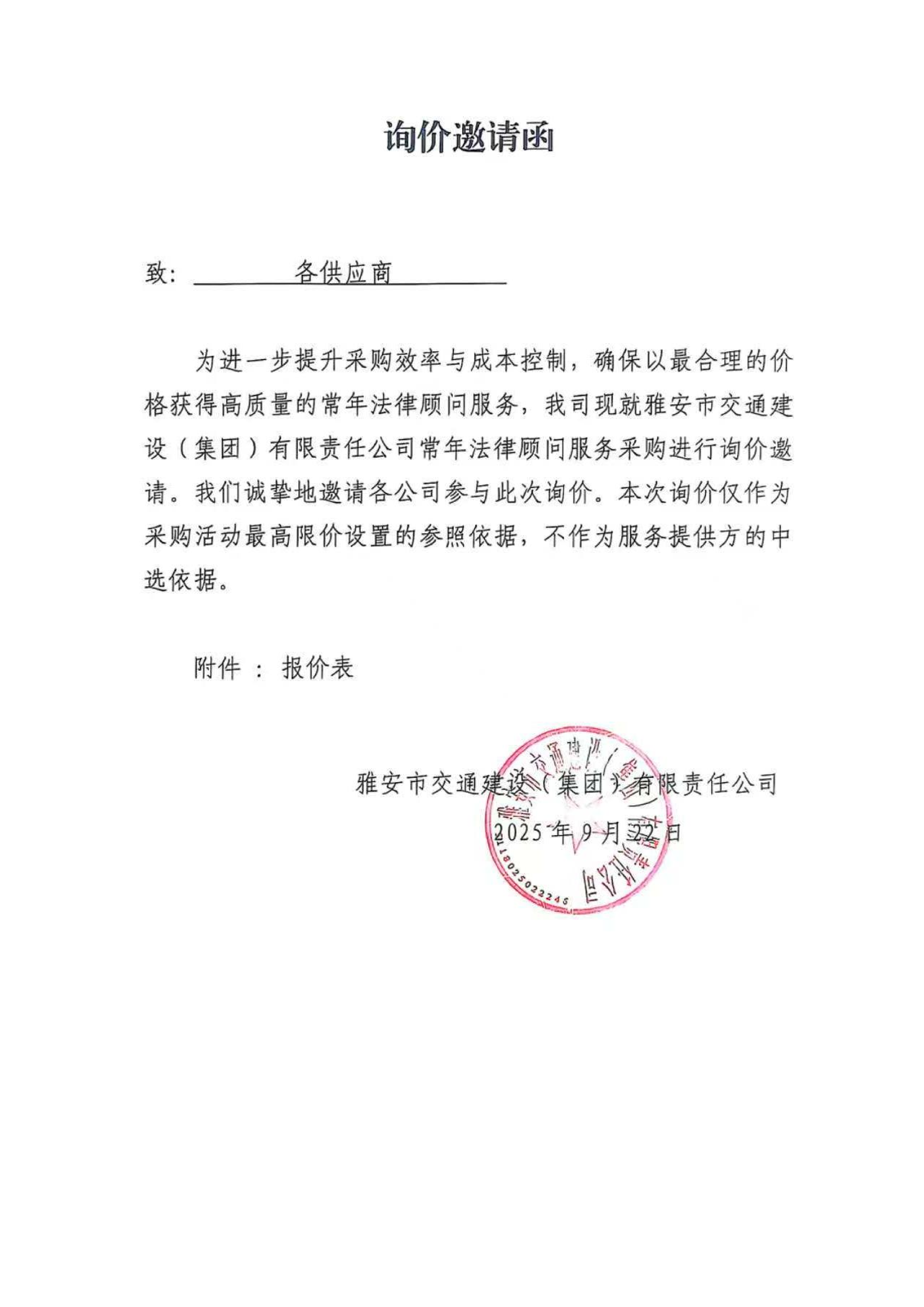 关于雅安市交通建设(集团)有限责任公司常年法律顾问服务的询价函