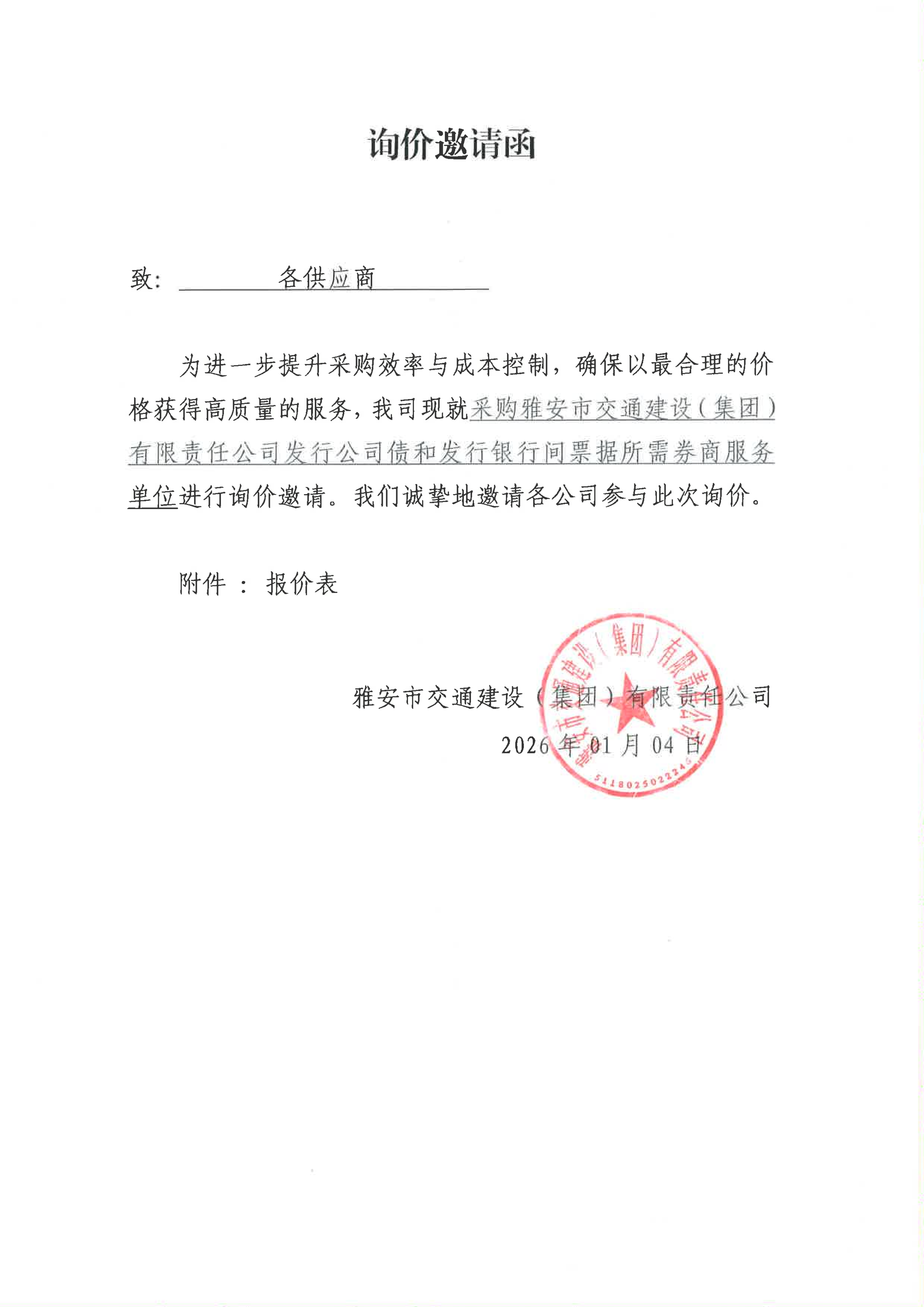 关于采购雅安市交通建设(集团)有限责任公司发行公司债和发行银行间票据所需券商服务限价的询价函