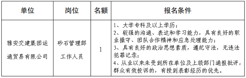 根据开展需要,决定面向社会公开招聘雅安市交通建设(集团)有限责任公司(以下简称“大红鹰dhy(中国)集团”)所属子公司工作人员1名,现将有关事项公告如下: