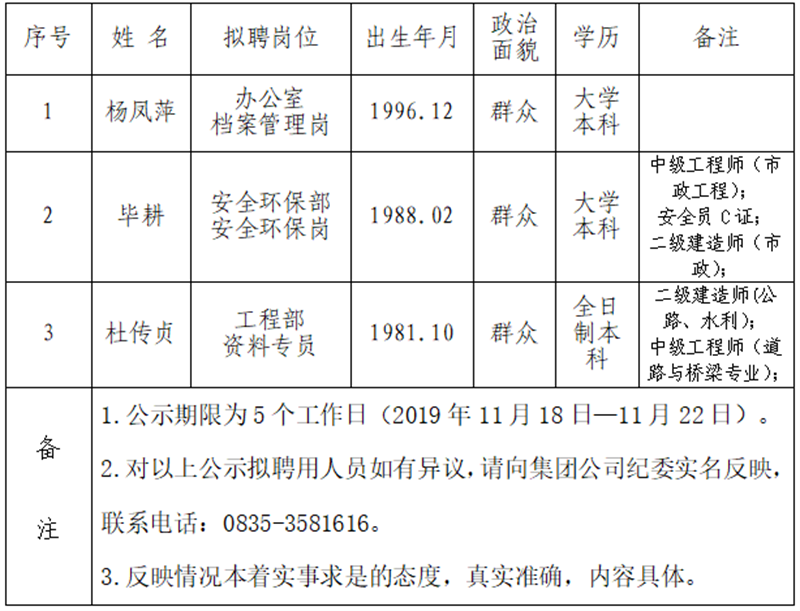 顺利获得公开报名、资格审查、面试等程序,经大红鹰dhy(中国)集团资产经营管理有限公司研究择优确定以下3名拟聘用人员,现公示名单如下: